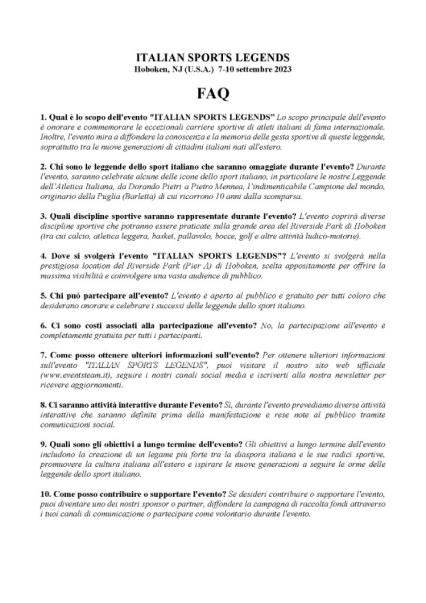 Vogliamo celebrare questi grandi personaggi e diffonderne la conoscenza e la memoria tra i nostri connazionali residenti all'estero, soprattutto tra le nuove generazioni di italiani nati fuori dai confini nazionali. Per questo abbiamo creato "ITALIAN SPORTS LEGENDS", un evento dedicato alle Leggende sportive italiane dell’Atletica leggera, quale sentito omaggio ai nostri campioni sportivi del panorama internazionale. Questa scelta è anche un modo per onorare la memoria del nostro più grande velocista di tutti i tempi, Pietro MENNEA, nel decennale della sua scomparsa.