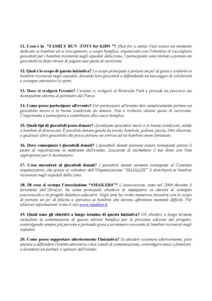 Il programma dell’evento prevede diverse attività, tra cui una mostra espositiva sulle nostre Leggende sportive ed un villaggio sportivo dove praticare attività motoria. Inoltre ci sarà anche una iniziativa a scopo benefico - la "FAMILY RUN - TOYS for KIDS” (Corri per un sorriso) - organizzata con l'obiettivo di raccogliere giocattoli per i bambini meno fortunati. I partecipanti, infatti, sono invitati a portare un giocattolo al posto della quota di iscrizione da donare ai bambini meno fortunati. L’Organizzazione di volontariato SMAILERS, con una rappresentanza di alcuni suoi volontari giunti appositamente dall’Italia, consegnerà i giocattoli ai bambini degli Ospedali Pediatrici della zona (NY-NJ)